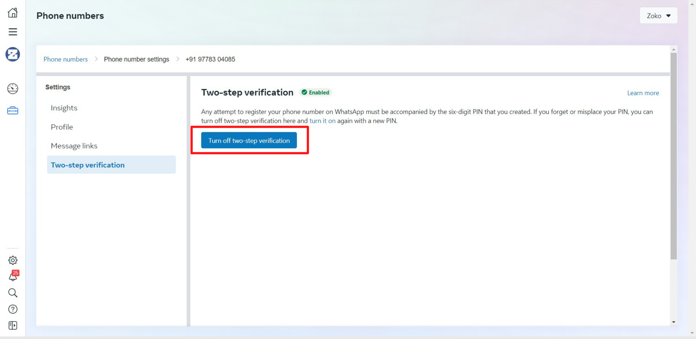 Suppose your previous provider has enabled 2FA, and you are migrating your number to us. In that case, you will need to disable 2FA on your Facebook business manager page in order to activate your account with us.